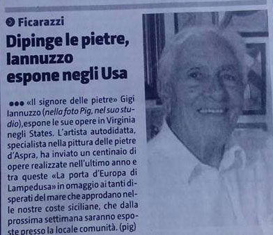 Il pittore di pietre, Gigi Iannuzzo, esporrà le sue pietre dipinte di Aspra in Virginia, Stati Uniti, a Settembre. Un centinaio le pietre dipinte tra cui una dedicata a Lampedusa e allo sbarco di immigrati. Iannuzzo pittore autodidatta ha scelto le pietre d’Aspra come base per le sue opere. Una unicità che le rende singolari. Ora anche negli Stases potranna ammirare le opere di Gigi.